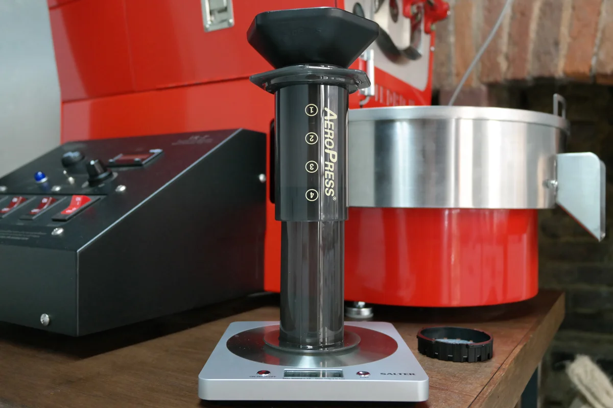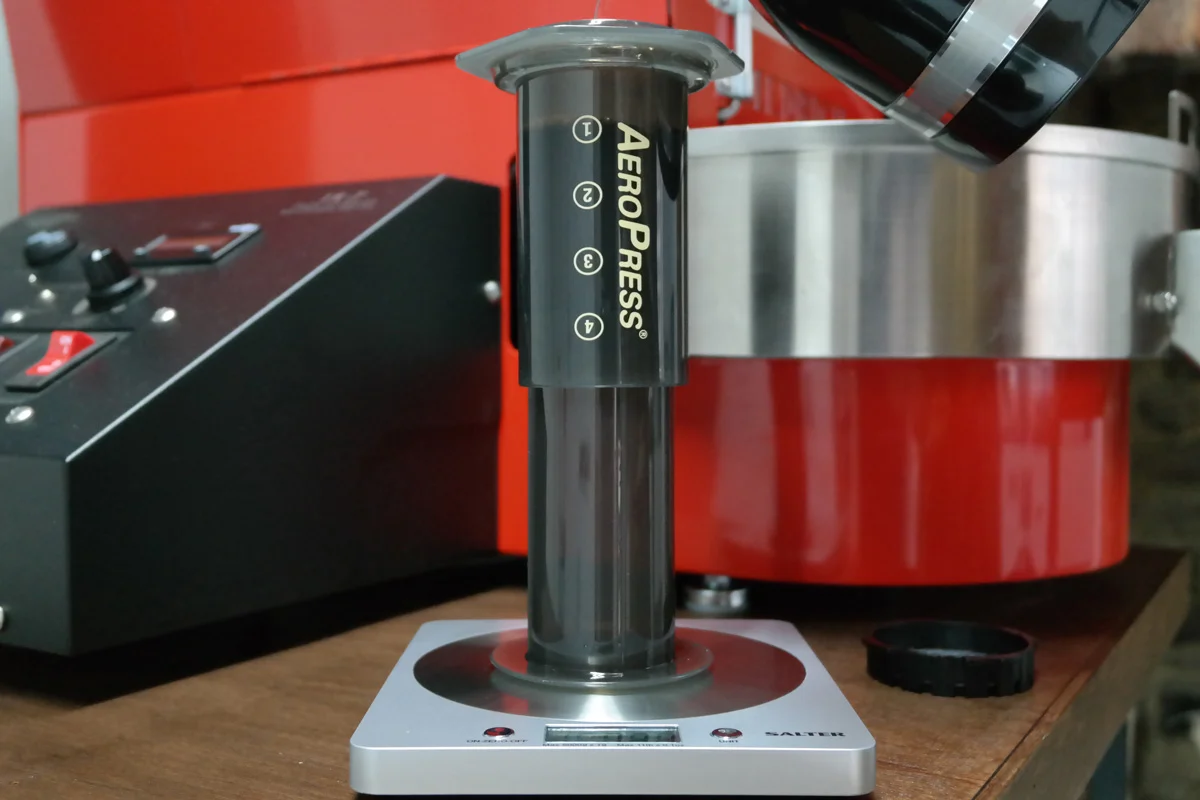 Turn the aeropress around, place on the table. A little coffee may start to drip through to your glass/cup at this point.